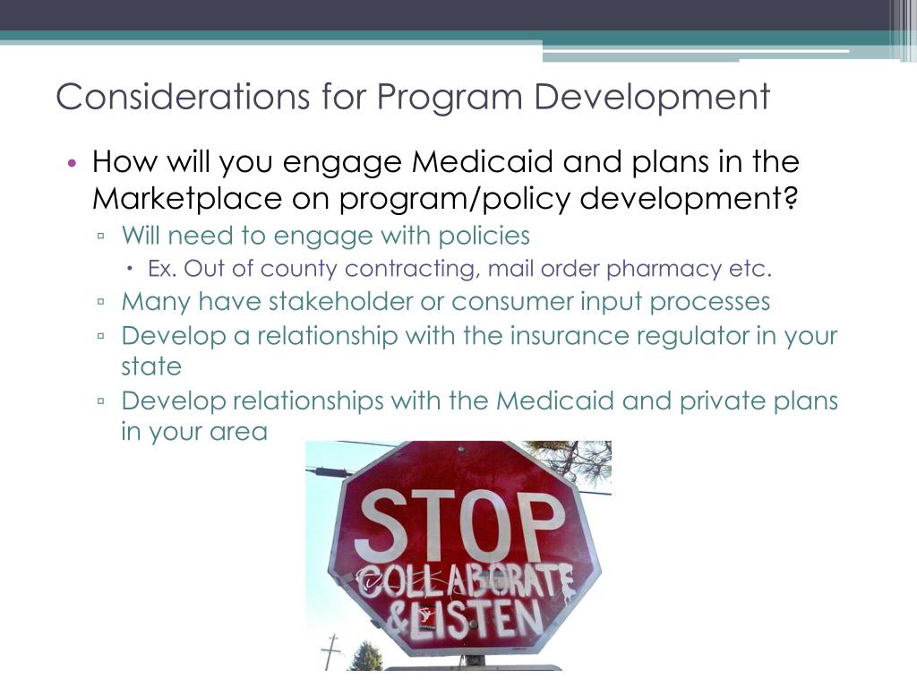 Considerations for Program Development • How will you engage Medicaid and plans in the Marketplace on program/policy development? • Will need to engage with policies • Ex. Out of county contracting, mail order pharmacy etc. • Many have stakeholder or consumer input processes • Develop a relationship with the insurance regulator in your state • Develop relationships with the Medicaid and private plans in your area