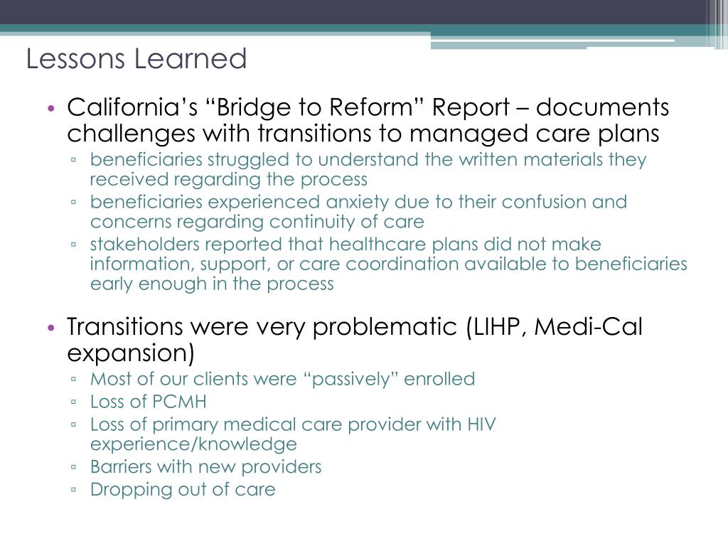 Lessons Learned • California’s “Bridge to Reform” Report – documents challenges with transitions to managed care plans • beneficiaries struggled to understand the written materials they received regarding the process • beneficiaries experienced anxiety due to their confusion and concerns regarding continuity of care • stakeholders reported that healthcare plans did not make information, support, or care coordination available to beneficiaries early enough in the process • Transitions were very problematic (LIHP, Medi-Cal expansion) • Most of our clients were “passively” enrolled • Loss of PCMH • Loss of primary medical care provider with HIV experience/knowledge • Barriers with new providers • Dropping out of care