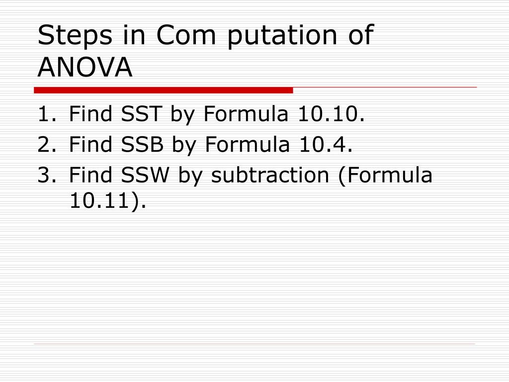 Steps in Com putation of ANOVA • Find SST by Formula 10.10. • Find SSB by Formula 10.4. • Find SSW by subtraction (Formula 10.11).