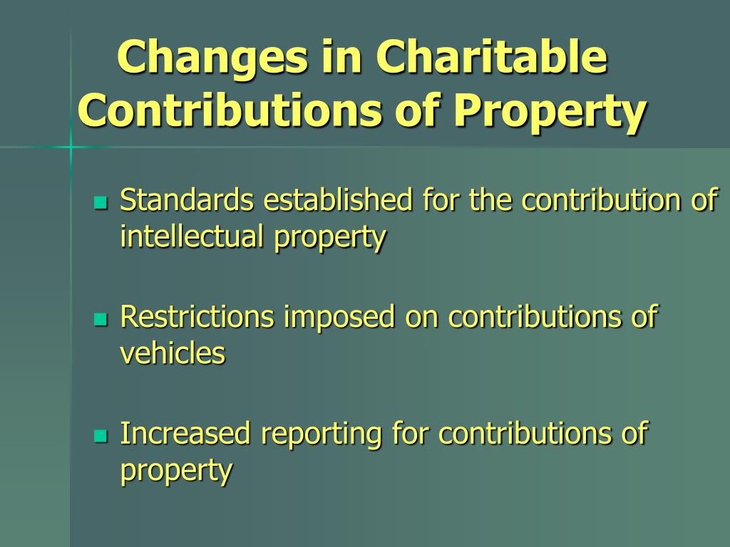 Changes in Charitable Contributions of Property • Standards established for the contribution of intellectual property • Restrictions imposed on contributions of vehicles • Increased reporting for contributions of property
