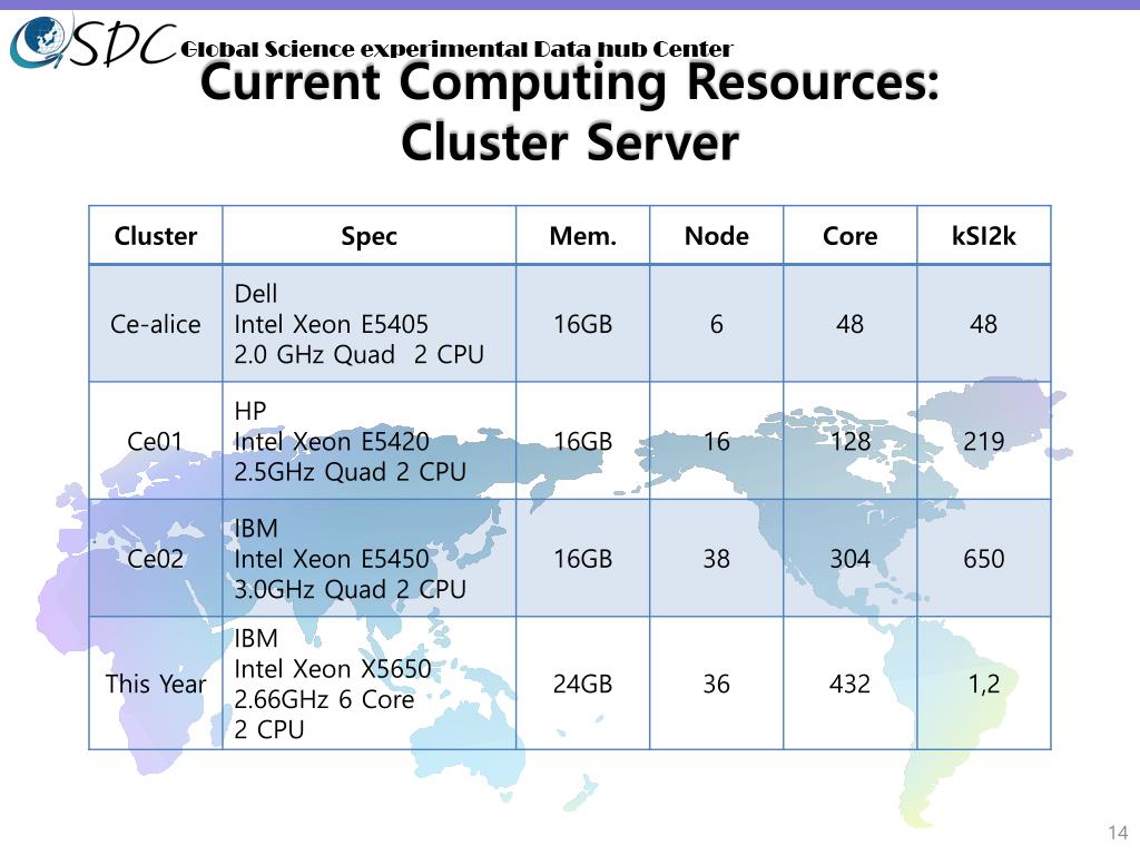 Current Resources CPUs Intel Xeon E5450 300cores ≈ 960kSI2K (1core = 3.2kSI2K) shared queue Storages Disk: 100TB Tape: 100TB Network 10G GLORIAD: Active Software SL10i on the Scientific Linux 5.5 64bits