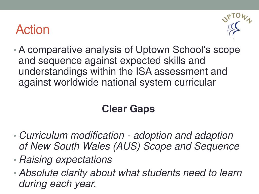 Action • A comparative analysis of Uptown School’s scope and sequence against expected skills and understandings within the ISA assessment and against worldwide national system curricular Clear Gaps • Curriculum modification - adoption and adaption of New South Wales (AUS) Scope and Sequence • Raising expectations • Absolute clarity about what students need to learn during each year.