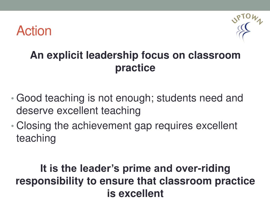 Action An explicit leadership focus on classroom practice • Good teaching is not enough; students need and deserve excellent teaching • Closing the achievement gap requires excellent teaching It is the leader’s prime and over-riding responsibility to ensure that classroom practice is excellent