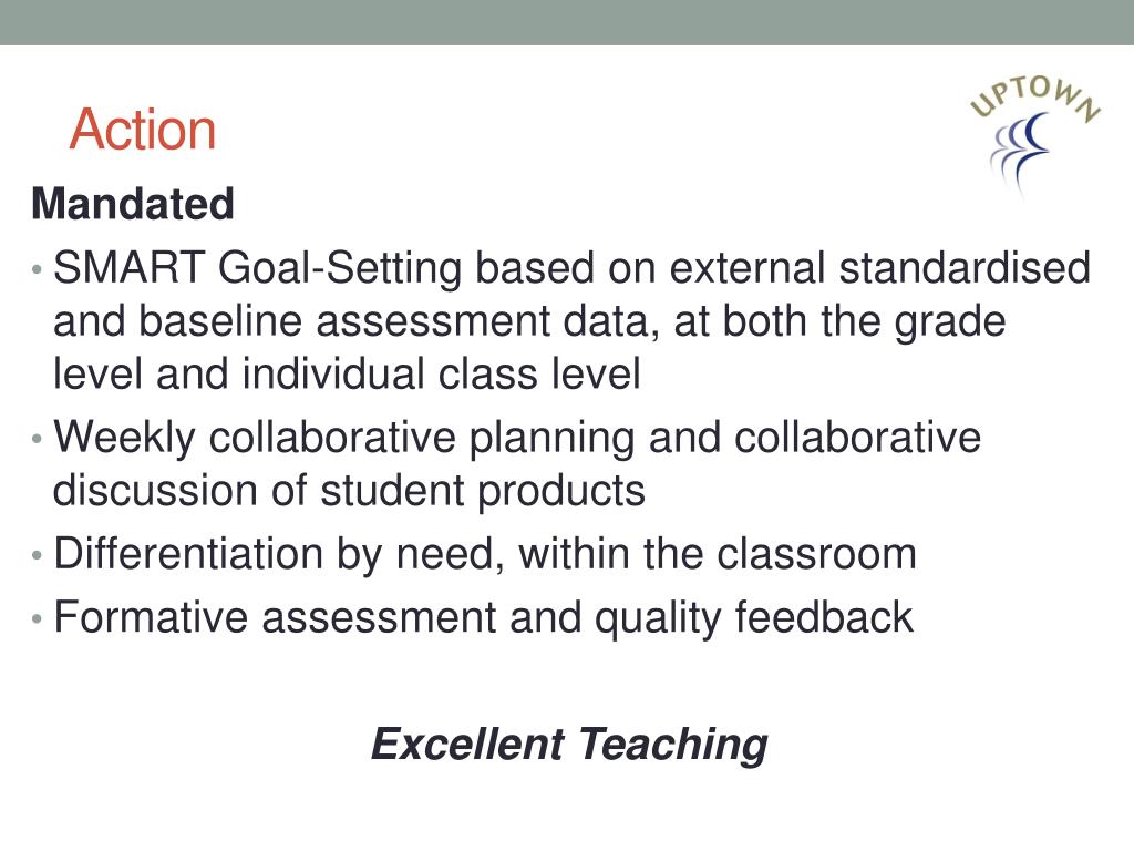 Action Mandated • SMART Goal-Setting based on external standardised and baseline assessment data, at both the grade level and individual class level • Weekly collaborative planning and collaborative discussion of student products • Differentiation by need, within the classroom • Formative assessment and quality feedback Excellent Teaching