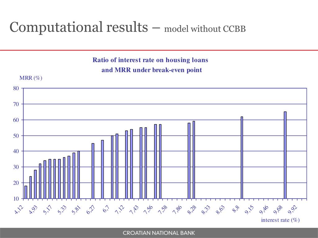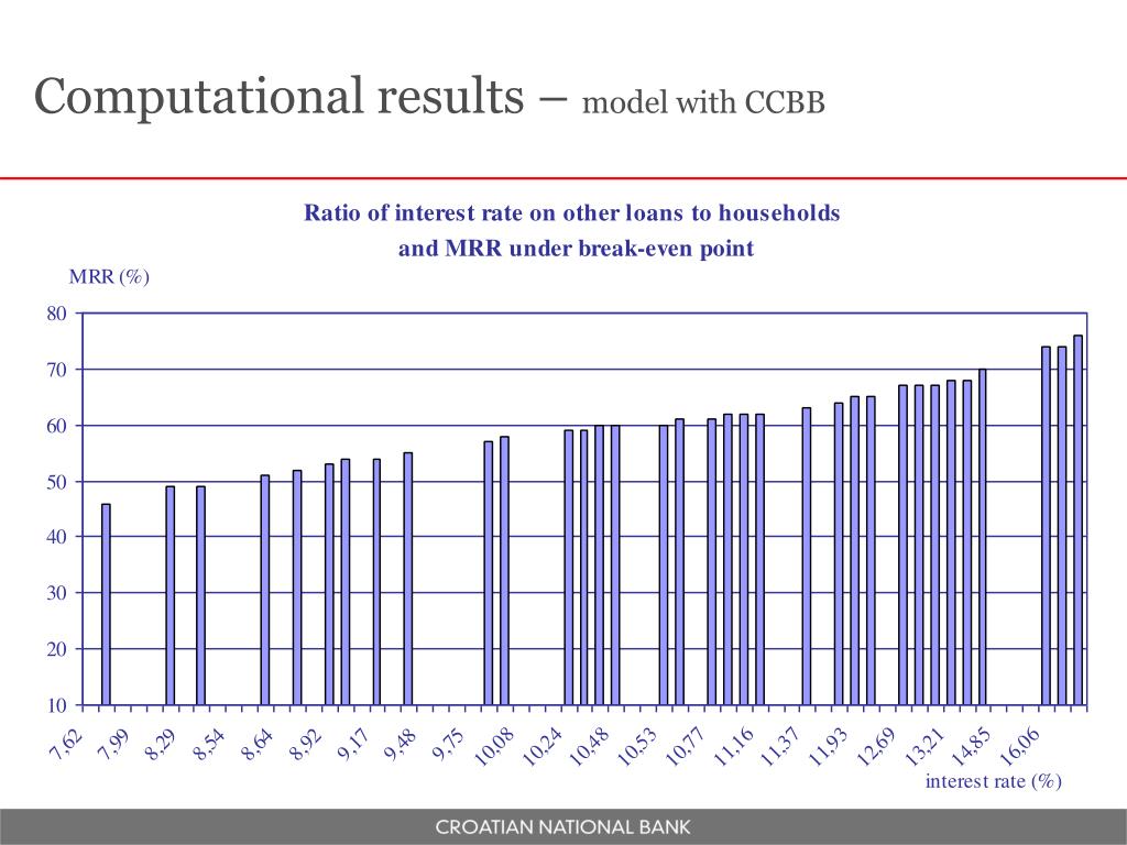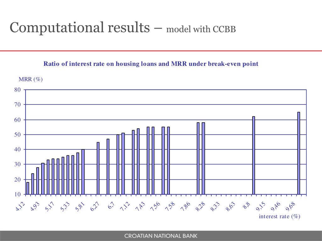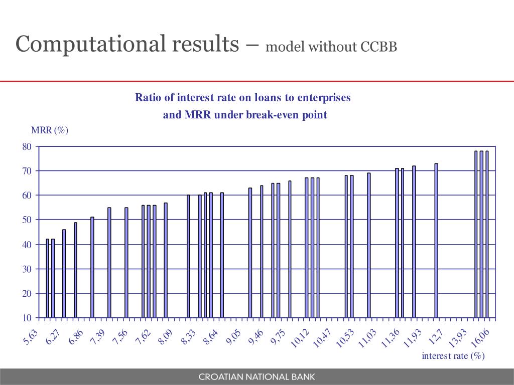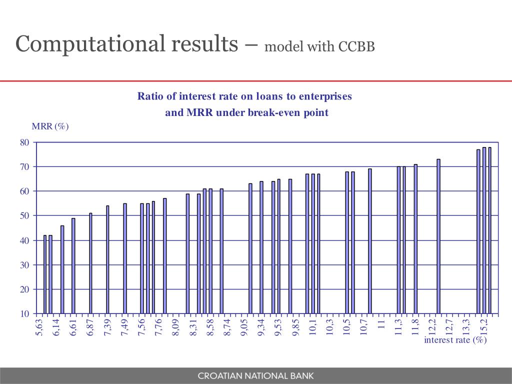 Computational results - comparisonof models • MRR in margin between 10 and 80% have effect on all banks and all types of their loans • only 8 banks don’t have housing loans • higher effect on housing and enterprises loans, and lower effect on other loans to households in first model • almost same effect on all type of loans in second model model without CCBB model with CCBB