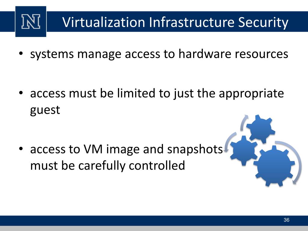 Virtualization Infrastructure Security • systems manage access to hardware resources • access must be limited to just the appropriate guest • access to VM image and snapshots must be carefully controlled