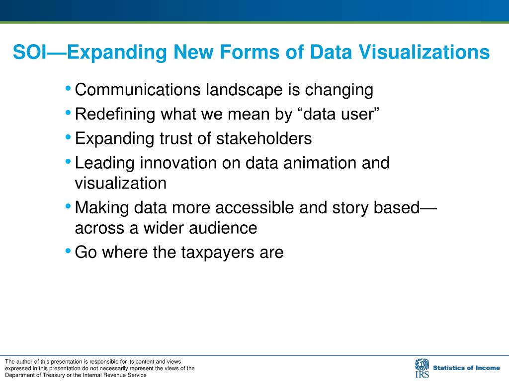 SOI—Expanding New Forms of Data Visualizations • Communications landscape is changing • Redefining what we mean by “data user” • Expanding trust of stakeholders • Leading innovation on data animation and visualization • Making data more accessible and story based—across a wider audience • Go where the taxpayers are The author of this presentation is responsible for its content and views expressed in this presentation do not necessarily represent the views of the Department of Treasury or the Internal Revenue Service