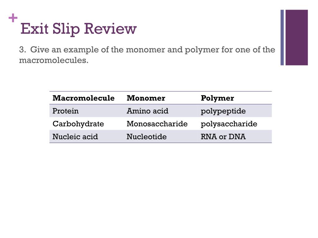 Exit Slip Review 3. Give an example of the monomer and polymer for one of the macromolecules.
