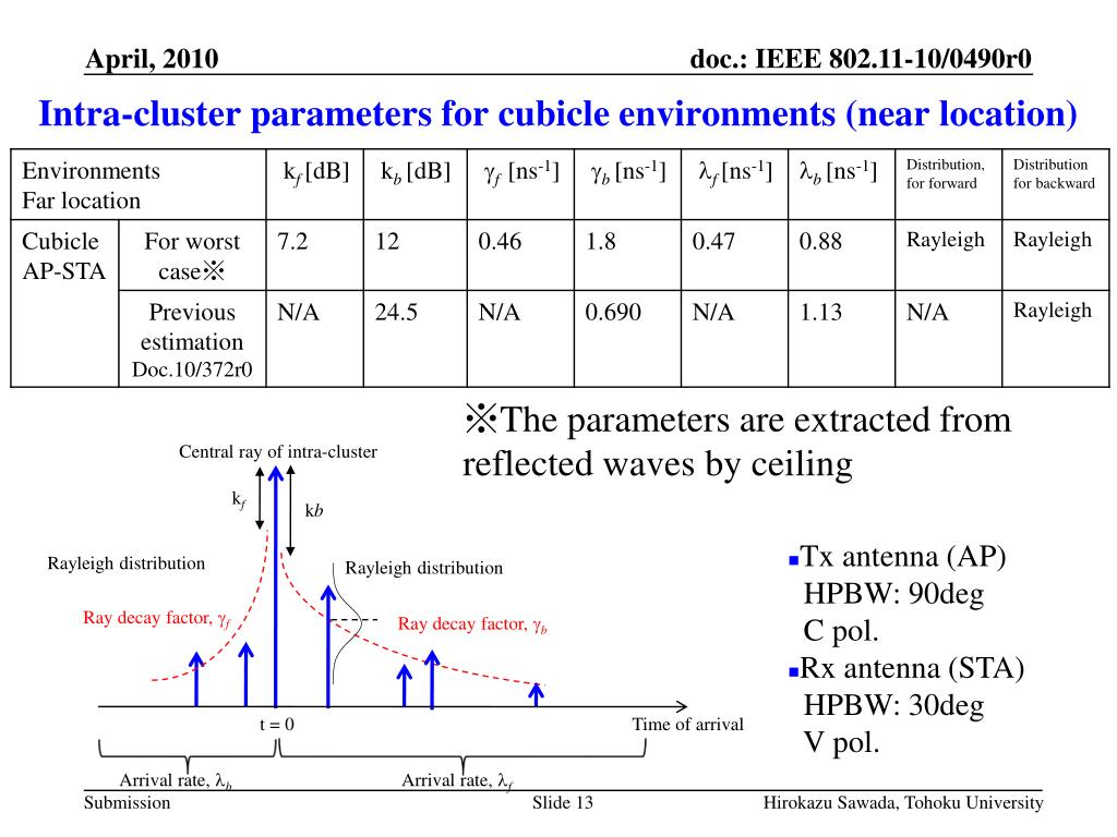 [Intra cluster response model and parameter for the enterprise cubicle environments at 60GHz (Part2)]. Date: 2010-4-29. Authors:. Abstract. This paper shows reflection wave characteristics by ceiling for the enterprise cubicle environment channel modeling For near location