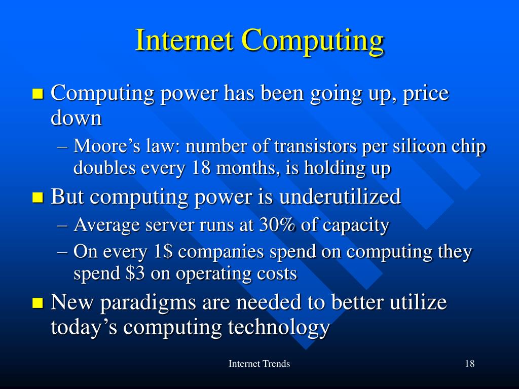 Internet Computing • Computing power has been going up, price down • Moore’s law: number of transistors per silicon chip doubles every 18 months, is holding up • But computing power is underutilized • Average server runs at 30% of capacity • On every 1$ companies spend on computing they spend $3 on operating costs • New paradigms are needed to better utilize today’s computing technology Internet Trends