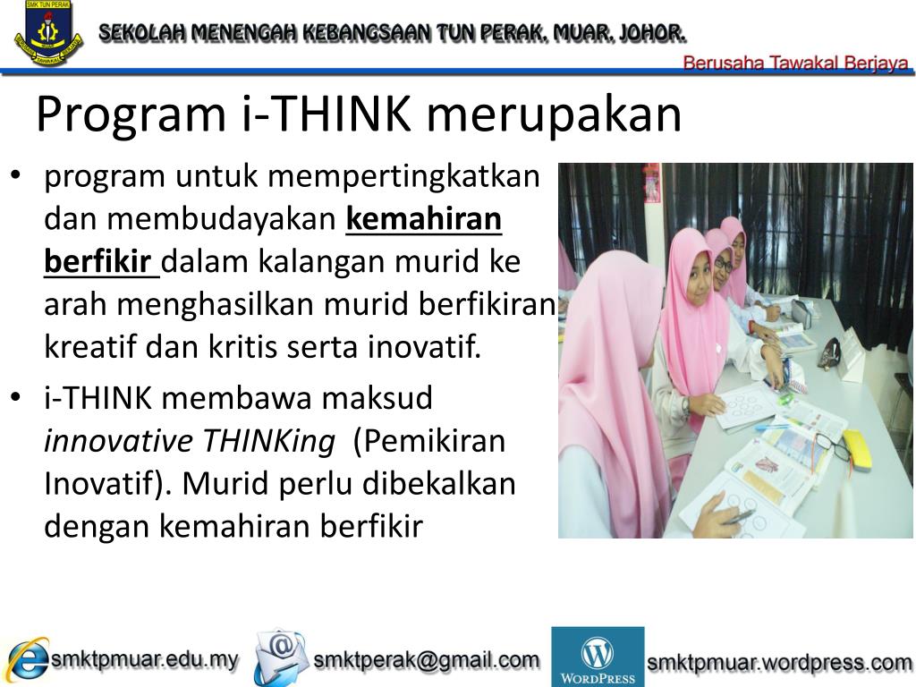 Program i-THINK merupakan • program untukmempertingkatkandanmembudayakankemahiranberfikirdalamkalanganmuridkearahmenghasilkanmuridberfikirankreatifdankritissertainovatif. • i-THINK membawamaksudinnovative THINKing (PemikiranInovatif). Muridperludibekalkandengankemahiranberfikir