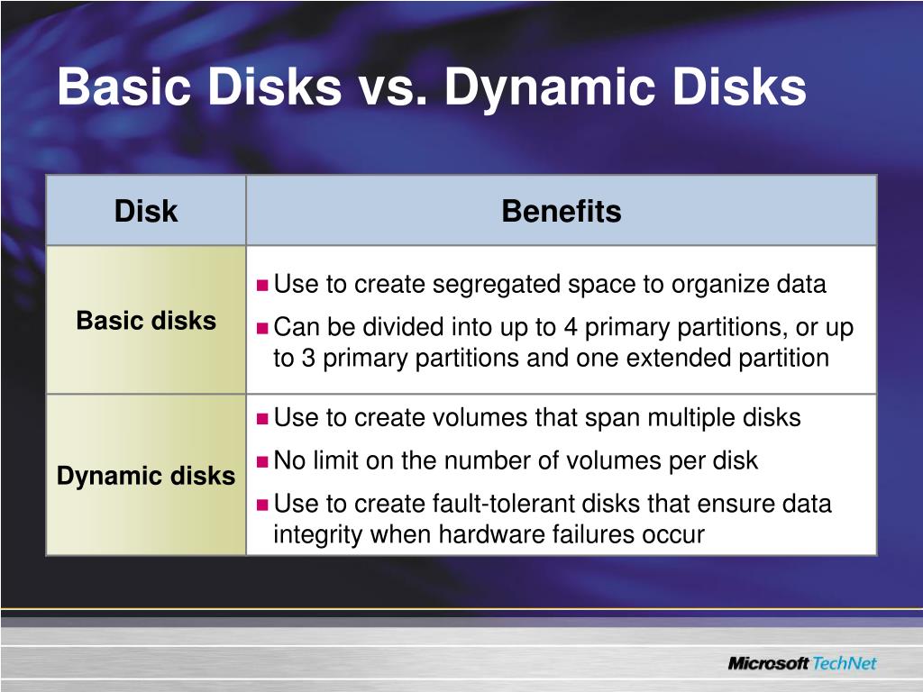 Results of Dynamic Disk Conversion • Can convert a disk from basic to dynamic storage at any time without losing data • Dynamic disks are associated with Disk Groups • Disk Groups help you organize dynamic disks • Each disk in a Disk Group stores replicas of the same configuration data • Windows initializes the disk with a Disk Group identity and a copy of the current Disk Group configuration • Existing partitions on the basic disk become volumes • Dynamic disks can be reverted back to basic disks • Disk structure and data is not maintained • Back up data before reverting