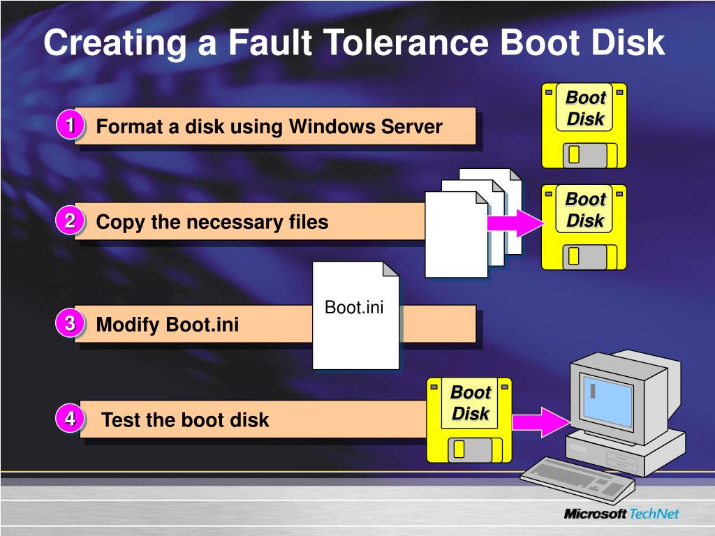 Boot Disk Boot Disk Boot Disk Creating a Fault Tolerance Boot Disk Format a disk using Windows Server 1 Copy the necessary files 2 Boot.ini Modify Boot.ini 3 Test the boot disk 4