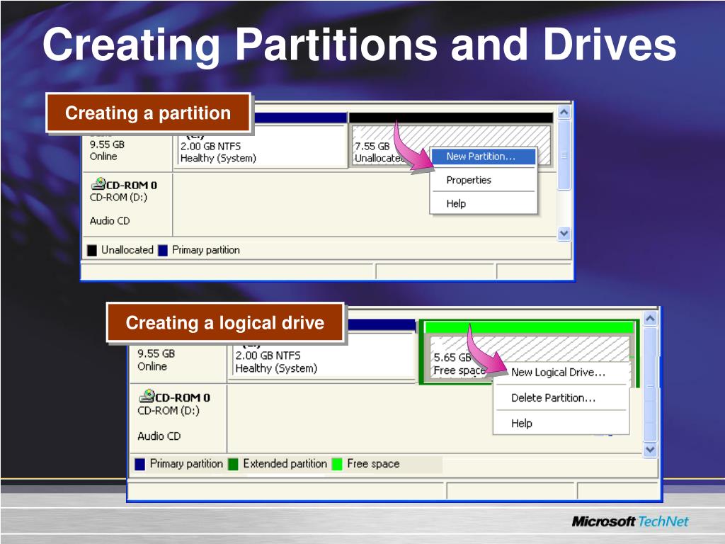 Creating Partitions and Drives Creating a partition Creating a logical drive