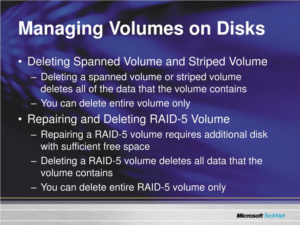 Managing Volumes on Disks • Deleting Spanned Volume and Striped Volume • Deleting a spanned volume or striped volume deletes all of the data that the volume contains • You can delete entire volume only • Repairing and Deleting RAID-5 Volume • Repairing a RAID-5 volume requires additional disk with sufficient free space • Deleting a RAID-5 volume deletes all data that the volume contains • You can delete entire RAID-5 volume only