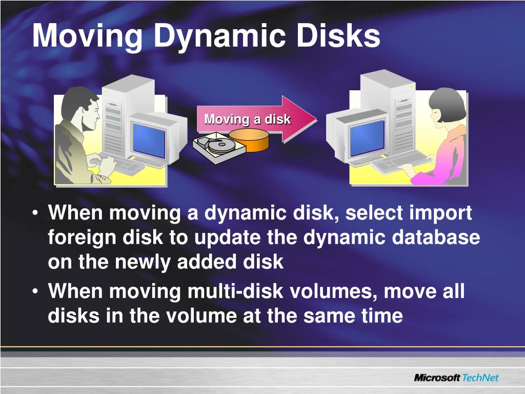 Moving Dynamic Disks • When moving a dynamic disk, select import foreign disk to update the dynamic database on the newly added disk • When moving multi-disk volumes, move all disks in the volume at the same time Moving a disk