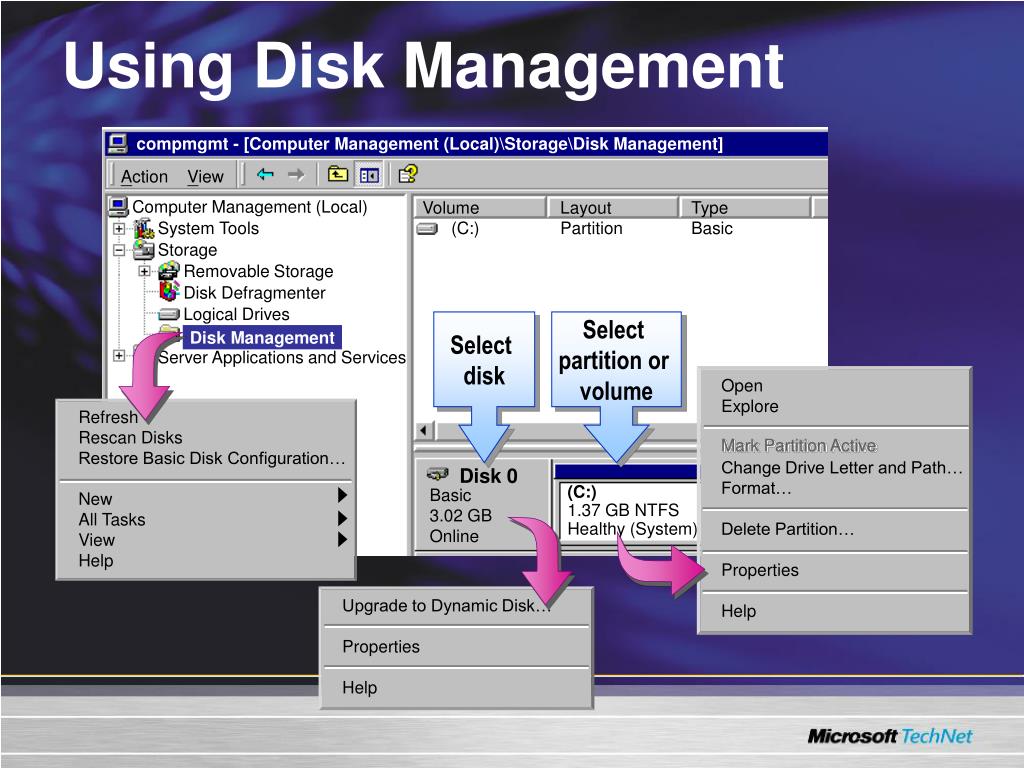 compmgmt - [Computer Management (Local)\Storage\Disk Management] Action View Computer Management (Local) System Tools Storage Removable Storage Disk Defragmenter Logical Drives Disk Management Server Applications and Services Volume (C:) Layout Partition Type Basic Select disk Select partition or volume Disk Management Open Explore Change Drive Letter and Path… Format… Delete Partition… Properties Help Upgrade to Dynamic Disk… Properties Help Refresh Rescan Disks Restore Basic Disk Configuration… New All Tasks View Help Mark Partition Active Disk 0 (C:) 1.37 GB NTFS Healthy (System) Basic 3.02 GB Online Using Disk Management