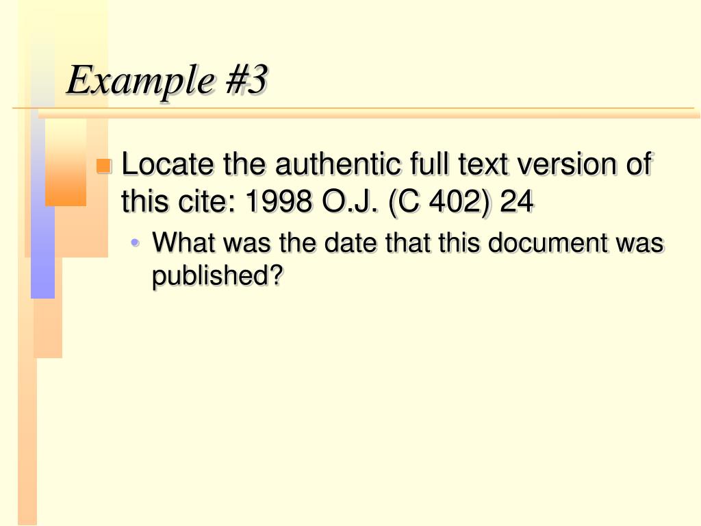 Example #3 • Locate the authentic full text version of this cite: 1998 O.J. (C 402) 24 • What was the date that this document was published?