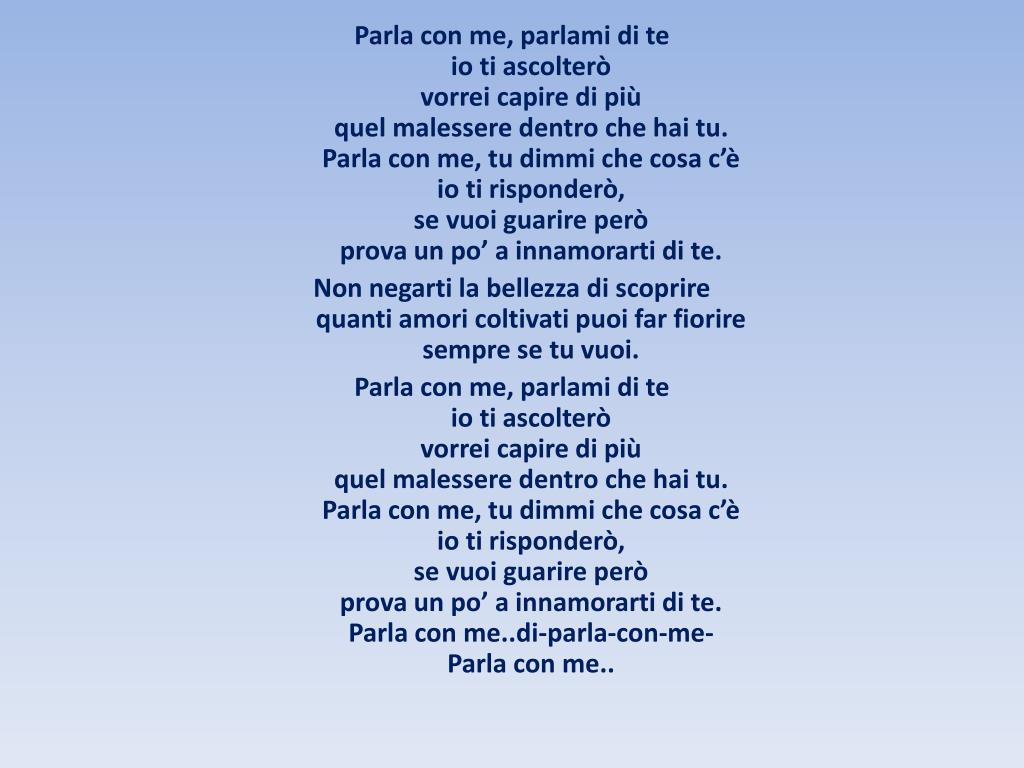 Parla con me, parlami di teio ti ascolteròvorrei capire di piùquel malessere dentro che hai tu.Parla con me, tu dimmi che cosa c’èio ti risponderò,se vuoi guarire peròprova un po’ a innamorarti di te. Non negarti la bellezza di scoprirequanti amori coltivati puoi far fioriresempre se tu vuoi. Parla con me, parlami di teio ti ascolteròvorrei capire di piùquel malessere dentro che hai tu.Parla con me, tu dimmi che cosa c’èio ti risponderò,se vuoi guarire peròprova un po’ a innamorarti di te.Parla con me..di-parla-con-me-Parla con me..