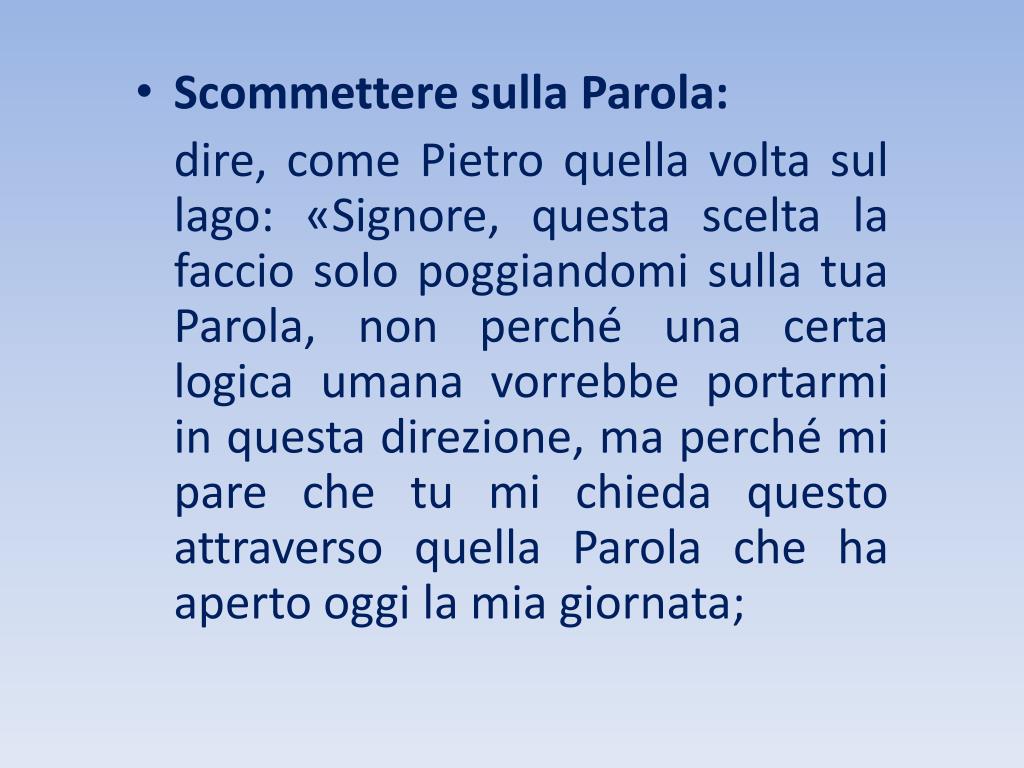 Scommettere sulla Parola: dire, come Pietro quella volta sul lago: «Signore, questa scelta la faccio solo poggiandomi sulla tua Parola, non perché una certa logica umana vorrebbe portarmi in questa direzione, ma perché mi pare che tu mi chieda questo attraverso quella Parola che ha aperto oggi la mia giornata;