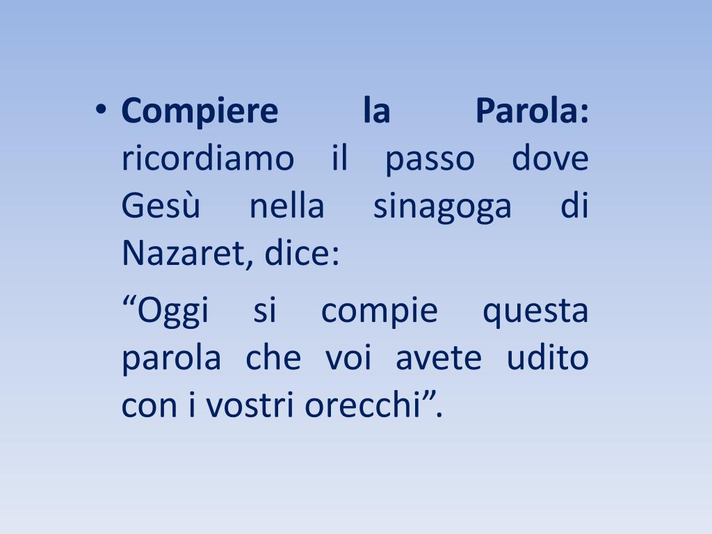 Compiere la Parola: ricordiamo il passo dove Gesù nella sinagoga di Nazaret, dice: “Oggi si compie questa parola che voi avete udito con i vostri orecchi”.