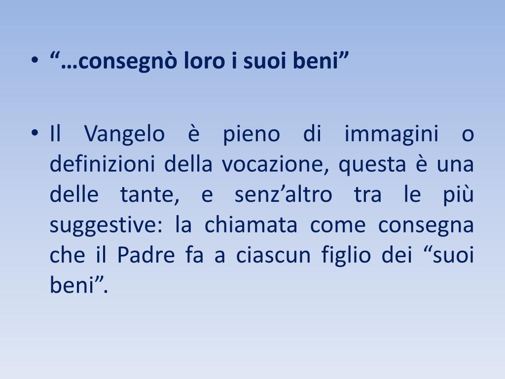 “…consegnò loro i suoi beni” • Il Vangelo è pieno di immagini o definizioni della vocazione, questa è una delle tante, e senz’altro tra le più suggestive: la chiamata come consegna che il Padre fa a ciascun figlio dei “suoi beni”.