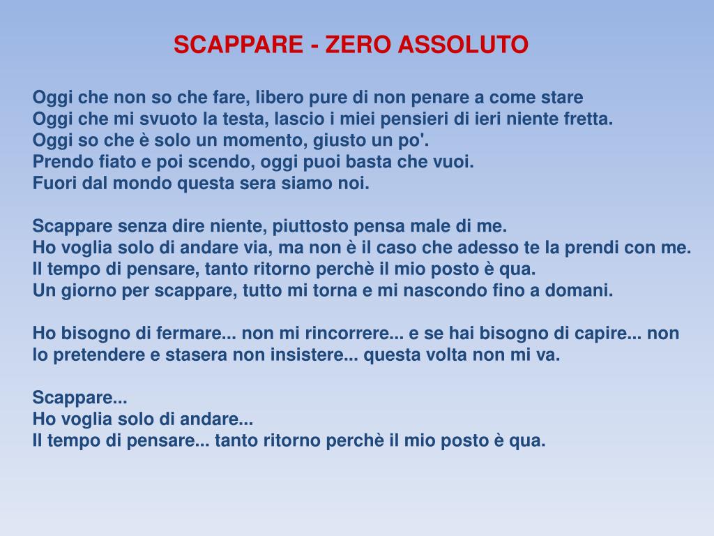 SCAPPARE - ZERO ASSOLUTO Oggi che non so che fare, libero pure di non penare a come stare Oggi che mi svuoto la testa, lascio i miei pensieri di ieri niente fretta. Oggi so che è solo un momento, giusto un po'. Prendo fiato e poi scendo, oggi puoi basta che vuoi. Fuori dal mondo questa sera siamo noi. Scappare senza dire niente, piuttosto pensa male di me. Ho voglia solo di andare via, ma non è il caso che adesso te la prendi con me. Il tempo di pensare, tanto ritorno perchè il mio posto è qua. Un giorno per scappare, tutto mi torna e mi nascondo fino a domani. Ho bisogno di fermare... non mi rincorrere... e se hai bisogno di capire... non lo pretendere e stasera non insistere... questa volta non mi va. Scappare... Ho voglia solo di andare... Il tempo di pensare... tanto ritorno perchè il mio posto è qua.