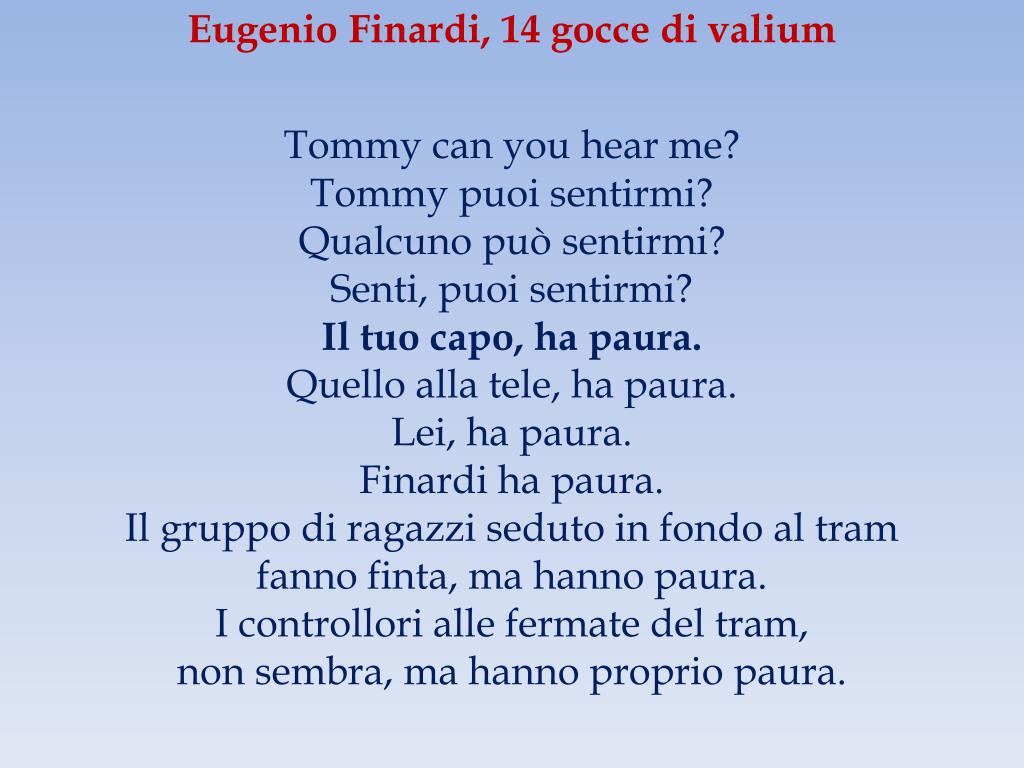 Eugenio Finardi, 14 gocce di valium Tommy can you hear me? Tommy puoi sentirmi? Qualcuno può sentirmi? Senti, puoi sentirmi? Il tuo capo, ha paura. Quello alla tele, ha paura. Lei, ha paura. Finardi ha paura. Il gruppo di ragazzi seduto in fondo al tram fanno finta, ma hanno paura. I controllori alle fermate del tram, non sembra, ma hanno proprio paura.