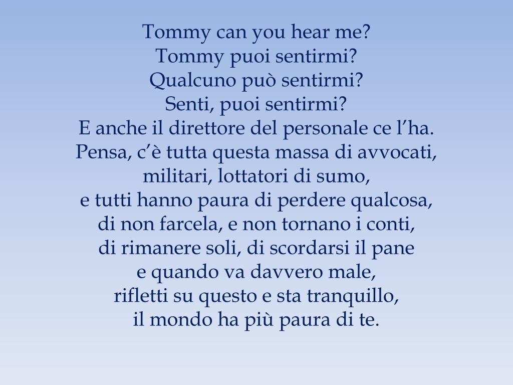 Tommy can you hear me? Tommy puoi sentirmi? Qualcuno può sentirmi? Senti, puoi sentirmi? E anche il direttore del personale ce l’ha. Pensa, c’è tutta questa massa di avvocati, militari, lottatori di sumo, e tutti hanno paura di perdere qualcosa, di non farcela, e non tornano i conti, di rimanere soli, di scordarsi il pane e quando va davvero male, rifletti su questo e sta tranquillo, il mondo ha più paura di te.