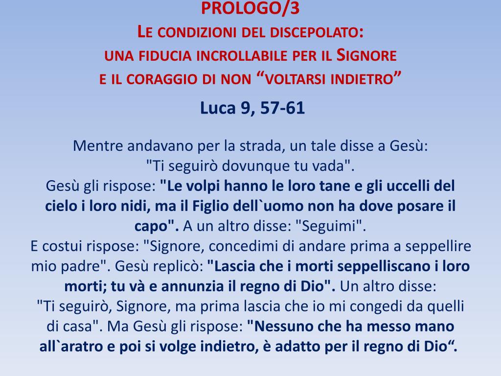 PROLOGO/3Le condizioni del discepolato: una fiducia incrollabile per il Signoree il coraggio di non “voltarsi indietro” Luca 9, 57-61 Mentre andavano per la strada, un tale disse a Gesù: "Ti seguirò dovunque tu vada". Gesù gli rispose: "Le volpi hanno le loro tane e gli uccelli del cielo i loro nidi, ma il Figlio dell`uomo non ha dove posare il capo". A un altro disse: "Seguimi". E costui rispose: "Signore, concedimi di andare prima a seppellire mio padre". Gesù replicò: "Lascia che i morti seppelliscano i loro morti; tu và e annunzia il regno di Dio". Un altro disse: "Ti seguirò, Signore, ma prima lascia che io mi congedi da quelli di casa". Ma Gesù gli rispose: "Nessuno che ha messo mano all`aratro e poi si volge indietro, è adatto per il regno di Dio“.