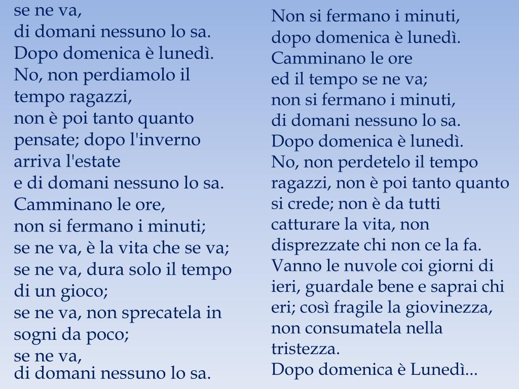 Non si fermano i minuti, dopo domenica è lunedì. Camminano le ore ed il tempo se ne va; non si fermano i minuti, di domani nessuno lo sa. Dopo domenica è lunedì. No, non perdetelo il tempo ragazzi, non è poi tanto quanto si crede; non è da tutti catturare la vita, non disprezzate chi non ce la fa. Vanno le nuvole coi giorni di ieri, guardale bene e saprai chi eri; così fragile la giovinezza, non consumatela nella tristezza. Dopo domenica è Lunedì... se ne va, di domani nessuno lo sa. Dopo domenica è lunedì. No, non perdiamolo il tempo ragazzi, non è poi tanto quanto pensate; dopo l'inverno arriva l'estate e di domani nessuno lo sa. Camminano le ore, non si fermano i minuti; se ne va, è la vita che se va; se ne va, dura solo il tempo di un gioco; se ne va, non sprecatela in sogni da poco; se ne va, di domani nessuno lo sa.