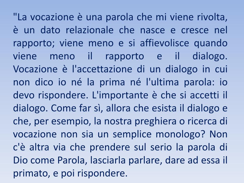 "La vocazione è una parola che mi viene rivolta, è un dato relazionale che nasce e cresce nel rapporto; viene meno e si affievolisce quando viene meno il rapporto e il dialogo.Vocazione è l'accettazione di un dialogo in cui non dico io né la prima né l'ultima parola: io devo rispondere. L'importante è che si accetti il dialogo. Come far sì, allora che esista il dialogo e che, per esempio, la nostra preghiera o ricerca di vocazione non sia un semplice monologo? Non c'è altra via che prendere sul serio la parola di Dio come Parola, lasciarla parlare, dare ad essa il primato, e poi rispondere.