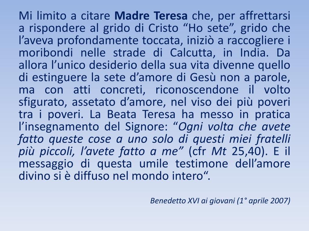 Mi limito a citare Madre Teresa che, per affrettarsi a rispondere al grido di Cristo “Ho sete”, grido che l’aveva profondamente toccata, iniziò a raccogliere i moribondi nelle strade di Calcutta, in India. Da allora l’unico desiderio della sua vita divenne quello di estinguere la sete d’amore di Gesù non a parole, ma con atti concreti, riconoscendone il volto sfigurato, assetato d’amore, nel viso dei più poveri tra i poveri. La Beata Teresa ha messo in pratica l’insegnamento del Signore: “Ogni volta che avete fatto queste cose a uno solo di questi miei fratelli più piccoli, l’avete fatto a me” (cfr Mt 25,40). E il messaggio di questa umile testimone dell’amore divino si è diffuso nel mondo intero“. Benedetto XVI ai giovani (1° aprile 2007)