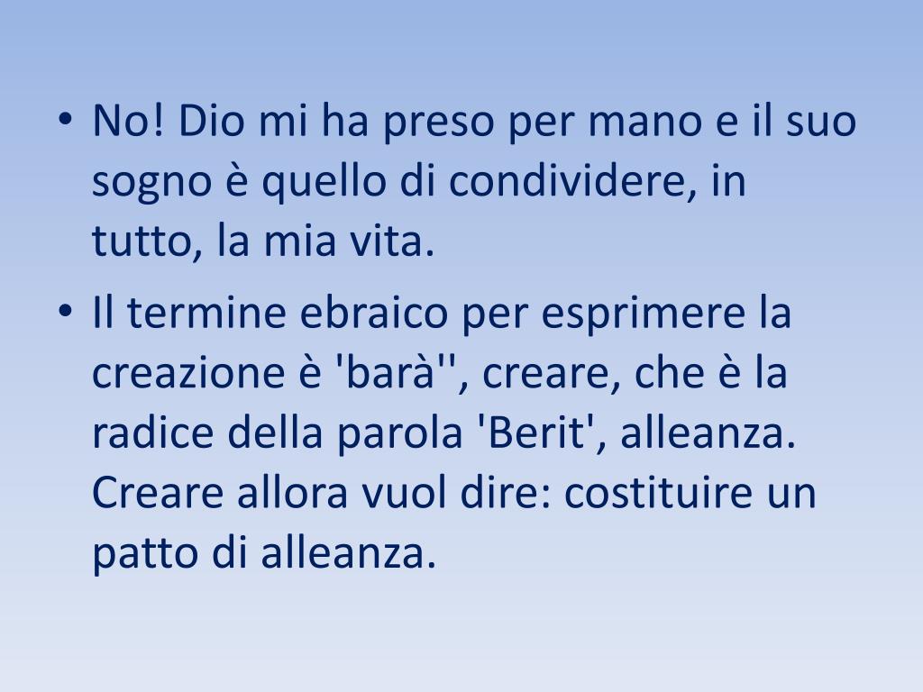 No! Dio mi ha preso per mano e il suo sogno è quello di condividere, in tutto, la mia vita. • Il termine ebraico per esprimere la creazione è 'barà'', creare, che è la radice della parola 'Berit', alleanza. Creare allora vuol dire: costituire un patto di alleanza.