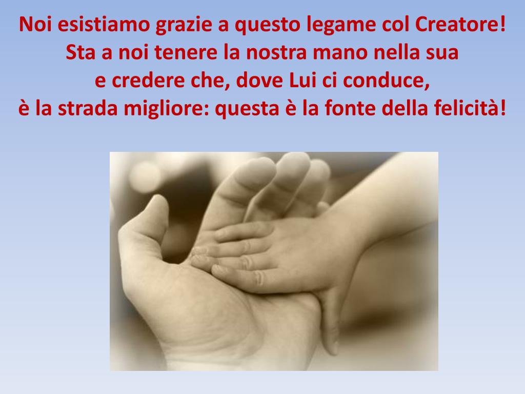 Noi esistiamo grazie a questo legame col Creatore! Sta a noi tenere la nostra mano nella sua e credere che, dove Lui ci conduce, è la strada migliore: questa è la fonte della felicità!