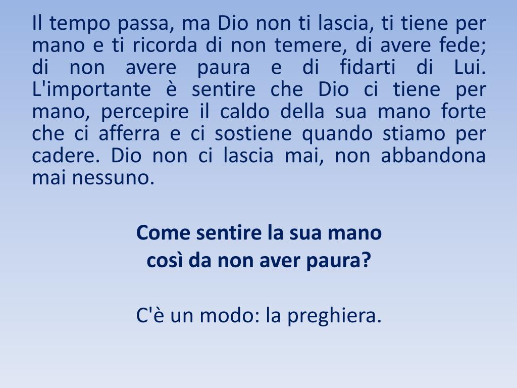 Il tempo passa, ma Dio non ti lascia, ti tiene per mano e ti ricorda di non temere, di avere fede; di non avere paura e di fidarti di Lui. L'importante è sentire che Dio ci tiene per mano, percepire il caldo della sua mano forte che ci afferra e ci sostiene quando stiamo per cadere. Dio non ci lascia mai, non abbandona mai nessuno. Come sentire la sua mano così da non aver paura? C'è un modo: la preghiera.