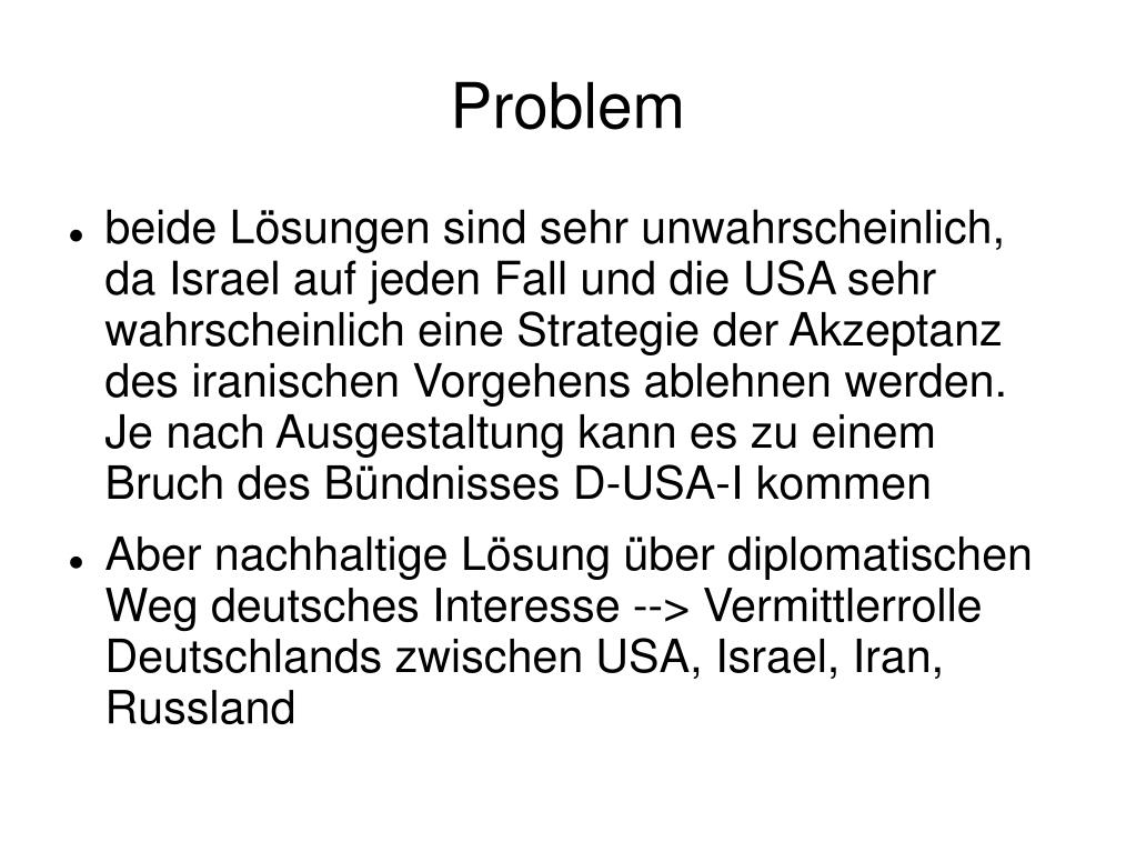 Problem beide Lösungen sind sehr unwahrscheinlich, da Israel auf jeden Fall und die USA sehr wahrscheinlich eine Strategie der Akzeptanz des iranischen Vorgehens ablehnen werden. Je nach Ausgestaltung kann es zu einem Bruch des Bündnisses D-USA-I kommen Aber nachhaltige Lösung über diplomatischen Weg deutsches Interesse --> Vermittlerrolle Deutschlands zwischen USA, Israel, Iran, Russland