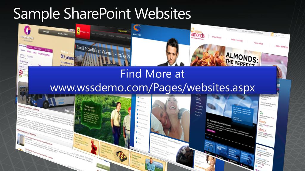 Sample SharePoint Websites Find More at www.wssdemo.com/Pages/websites.aspx