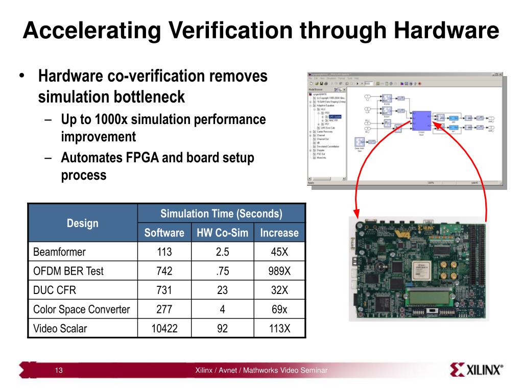 Accelerating Verification through Hardware • Hardware co-verification removes simulation bottleneck • Up to 1000x simulation performance improvement • Automates FPGA and board setup process Xilinx / Avnet / Mathworks Video Seminar