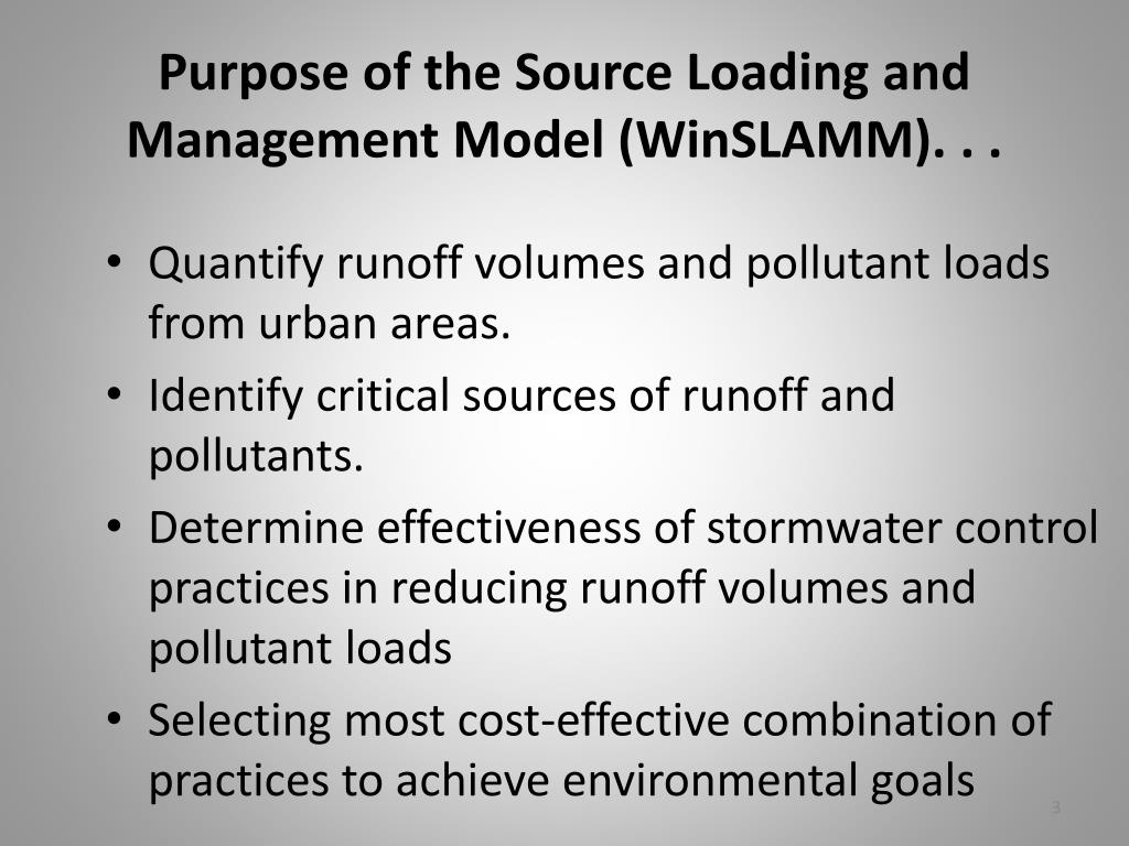 Purpose of the Source Loading and Management Model (WinSLAMM). . . • Quantify runoff volumes and pollutant loads from urban areas. • Identify critical sources of runoff and pollutants. • Determine effectiveness of stormwater control practices in reducing runoff volumes and pollutant loads • Selecting most cost-effective combination of practices to achieve environmental goals