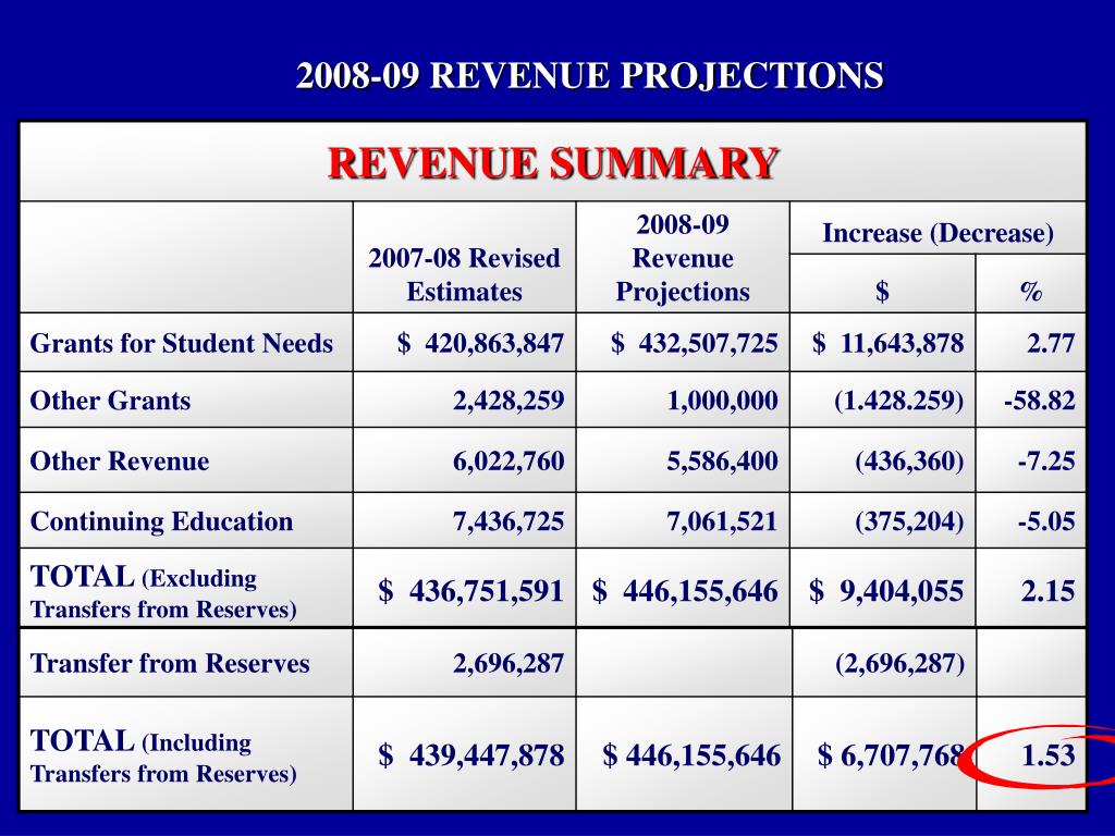 2008-09 REVENUE PROJECTIONS • REVIEW – to include • Support Material • Highlights of 2008-09 Grant Changes • Process to develop revenue estimates • Revenue Summary • Areas of concern and pressure points • Potential adjustments to revenue projections • Next Steps