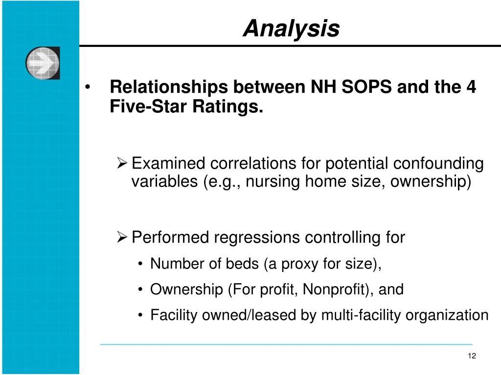 Analysis • Relationships between NH SOPS and the 4 Five-Star Ratings. • Examined correlations for potential confounding variables (e.g., nursing home size, ownership) • Performed regressions controlling for • Number of beds (a proxy for size), • Ownership (For profit, Nonprofit), and • Facility owned/leased by multi-facility organization
