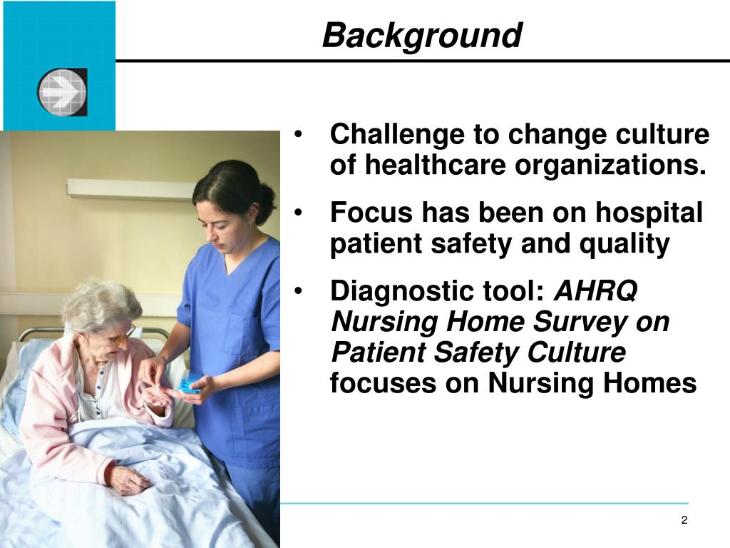 Challenge to change culture of healthcare organizations. Focus has been on hospital patient safety and quality Diagnostic tool: AHRQNursing Home Survey on Patient Safety Culture focuses on Nursing Homes Background