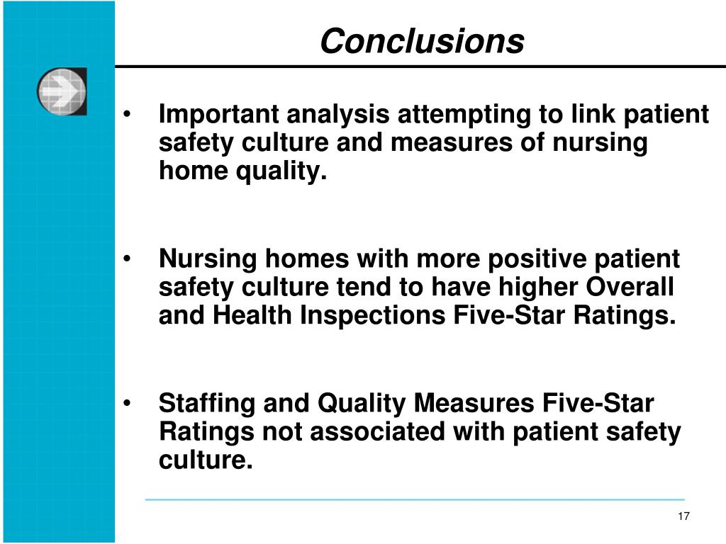 Conclusions • Important analysis attempting to link patient safety culture and measures of nursing home quality. • Nursing homes with more positive patient safety culture tend to have higher Overall and Health Inspections Five-Star Ratings. • Staffing and Quality Measures Five-Star Ratings not associated with patient safety culture.