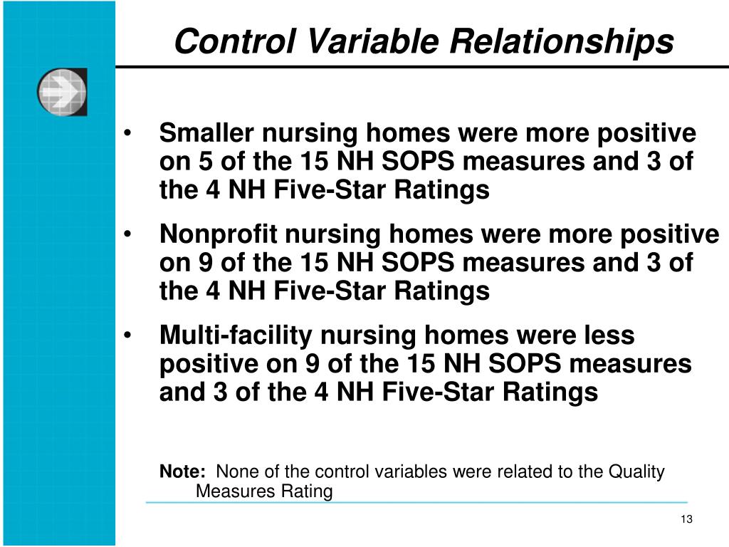 Control Variable Relationships • Smaller nursing homes were more positive on 5 of the 15 NH SOPS measures and 3 of the 4 NH Five-Star Ratings • Nonprofit nursing homes were more positive on 9 of the 15 NH SOPS measures and 3 of the 4 NH Five-Star Ratings • Multi-facility nursing homes were less positive on 9 of the 15 NH SOPS measures and 3 of the 4 NH Five-Star Ratings • Note: None of the control variables were related to the Quality Measures Rating