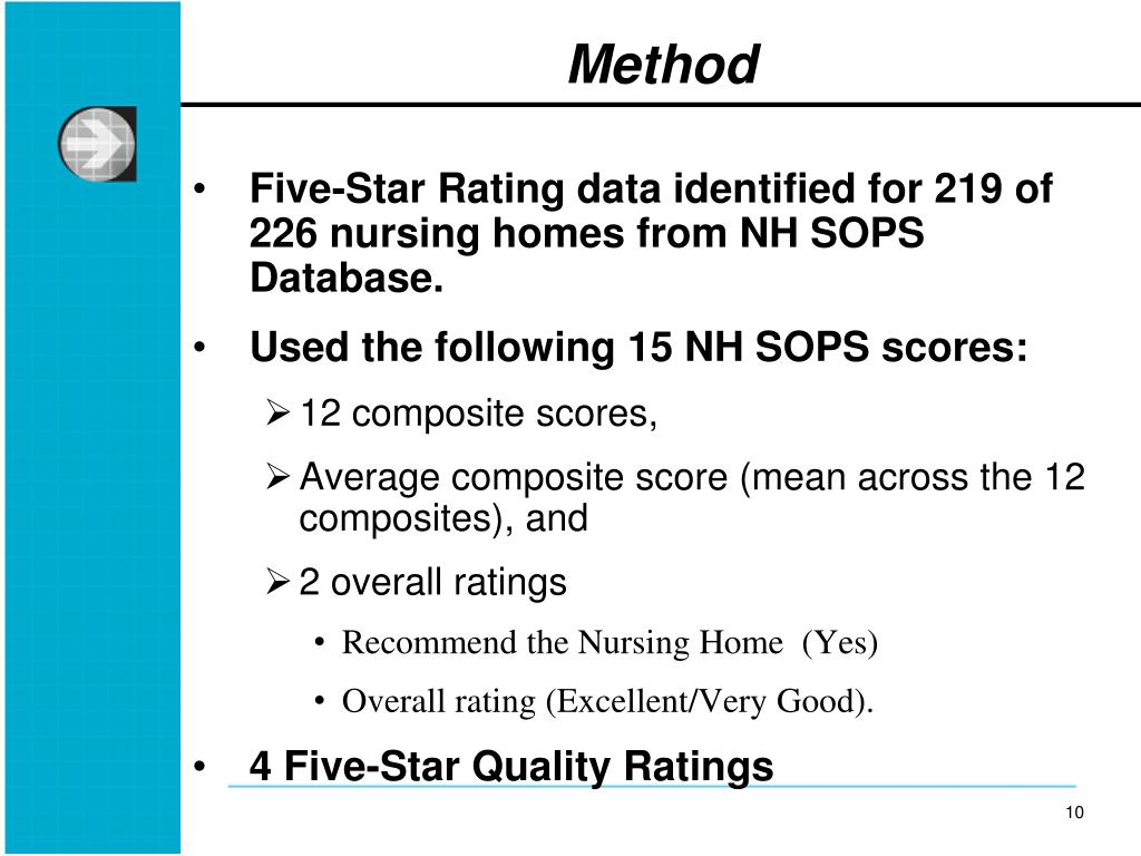 Method • Five-Star Rating data identified for 219 of 226 nursing homes from NH SOPS Database. • Used the following 15 NH SOPS scores: • 12 composite scores, • Average composite score (mean across the 12 composites), and • 2 overall ratings • Recommend the Nursing Home (Yes) • Overall rating (Excellent/Very Good). • 4 Five-Star Quality Ratings