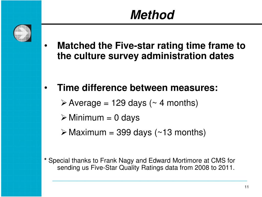 Method • Matched the Five-star rating time frame to the culture survey administration dates • Time difference between measures: • Average = 129 days (~ 4 months) • Minimum = 0 days • Maximum = 399 days (~13 months) • * Special thanks to Frank Nagy and Edward Mortimore at CMS for sending us Five-Star Quality Ratings data from 2008 to 2011.