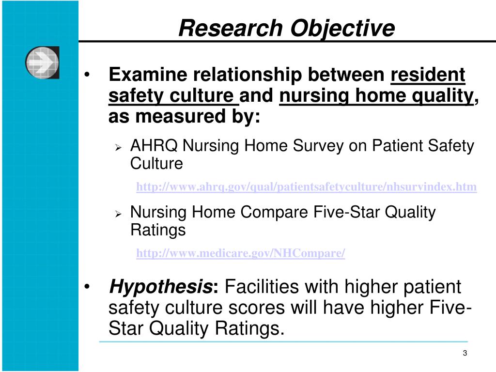 Research Objective • Examine relationship between resident safety culture and nursing home quality, as measured by: • AHRQ Nursing Home Survey on Patient Safety Culture • http://www.ahrq.gov/qual/patientsafetyculture/nhsurvindex.htm • Nursing Home Compare Five-Star Quality Ratings • http://www.medicare.gov/NHCompare/ • Hypothesis: Facilities with higher patient safety culture scores will have higher Five-Star Quality Ratings.