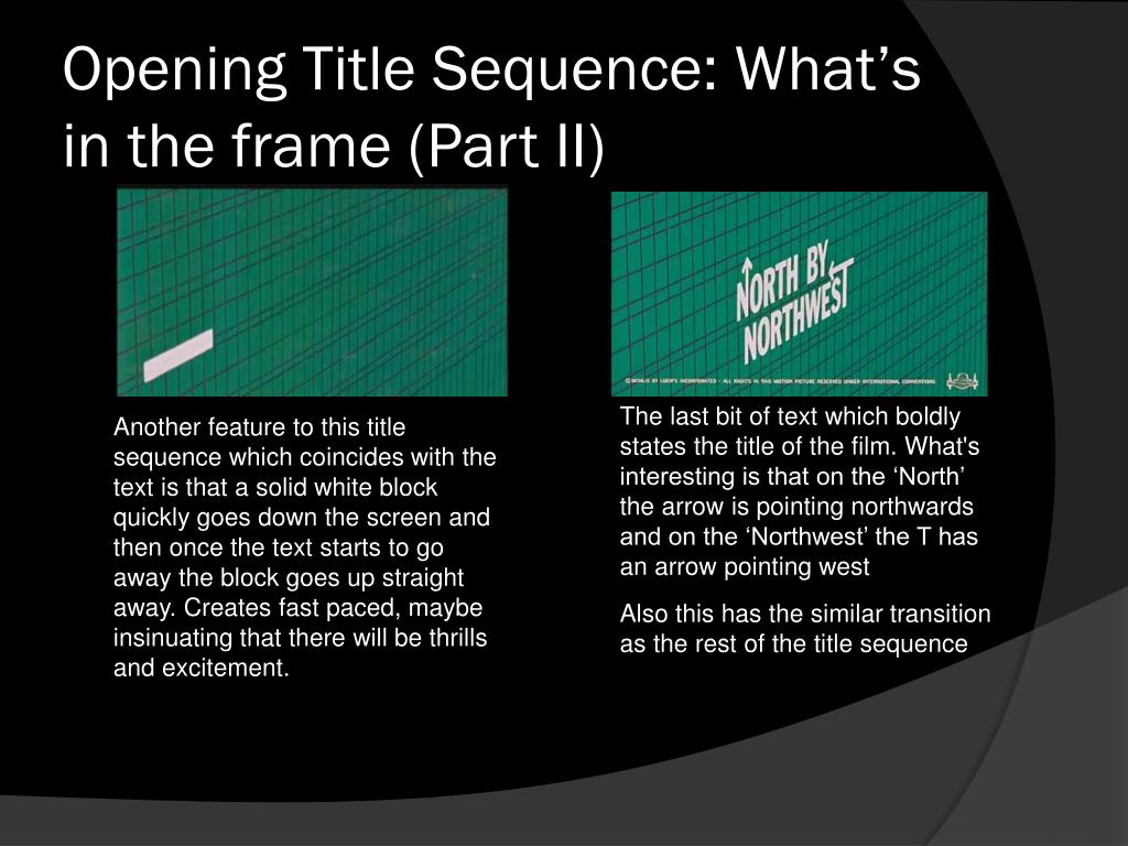 By Joseph Ratcliffe. North By Northwest (1959). Opening Title Sequence: What's in the frame. The title sequence is just below the 2 min mark. It starts of with a plane light green background, this soon changes with lines going across the screen in a diagonal.