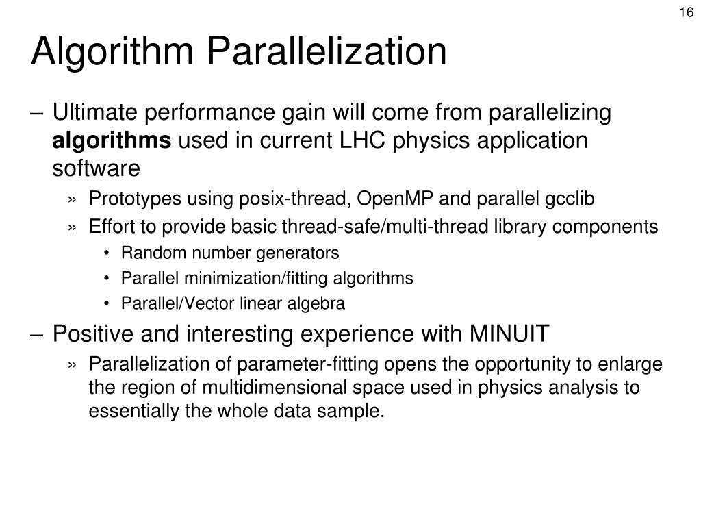 Algorithm Parallelization • Ultimate performance gain will come from parallelizing algorithms used in current LHC physics application software • Prototypes using posix-thread, OpenMP and parallel gcclib • Effort to provide basic thread-safe/multi-thread library components • Random number generators • Parallel minimization/fitting algorithms • Parallel/Vector linear algebra • Positive and interesting experience with MINUIT • Parallelization of parameter-fitting opens the opportunity to enlarge the region of multidimensional space used in physics analysis to essentially the whole data sample.